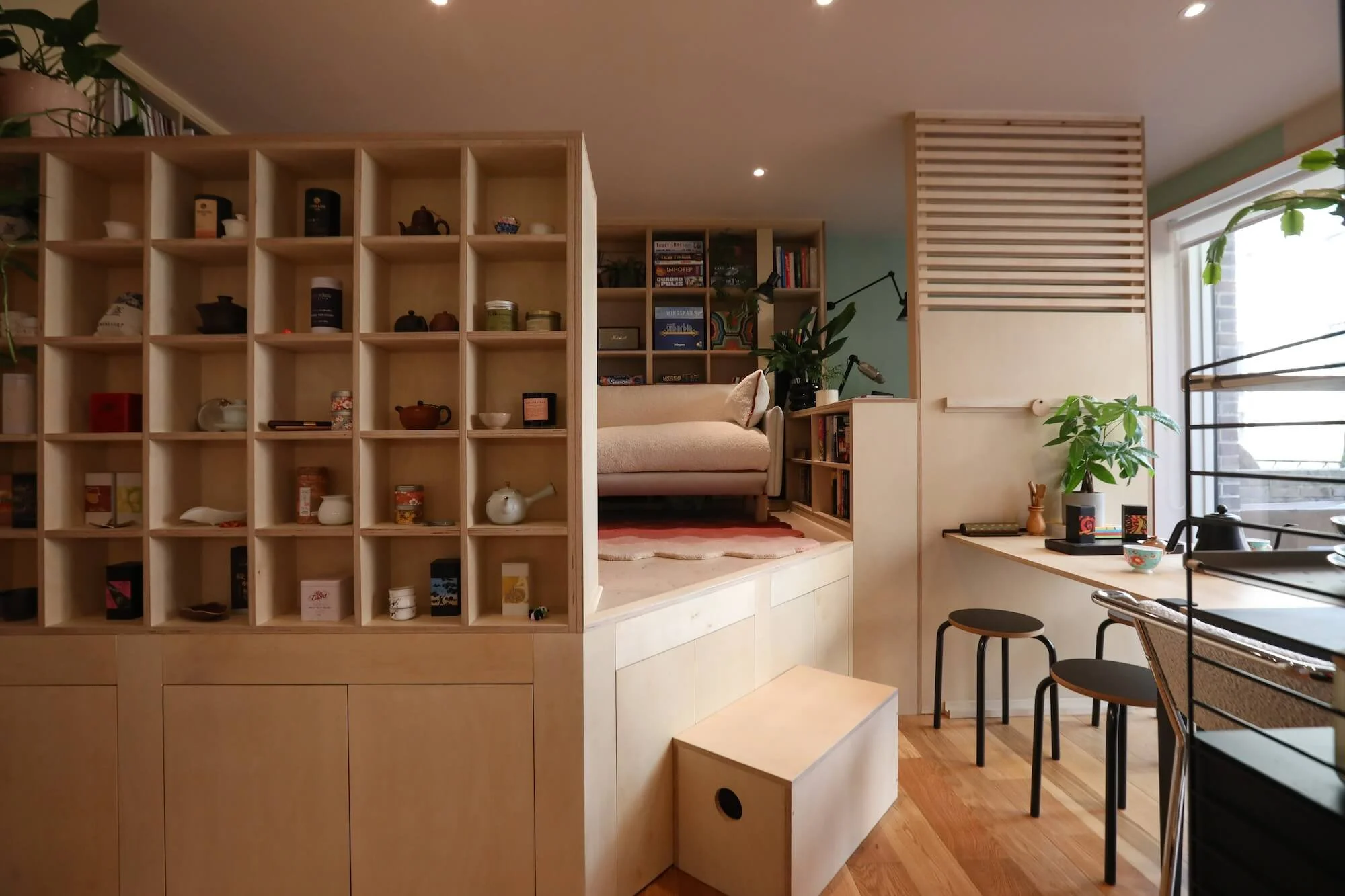 A Plywood Masterclass in custom storagea 1 bed new build in hoxton in need of storage. a trusting client ran with our vision and the result is this incredible room in a room with perfectly zoned spaces.