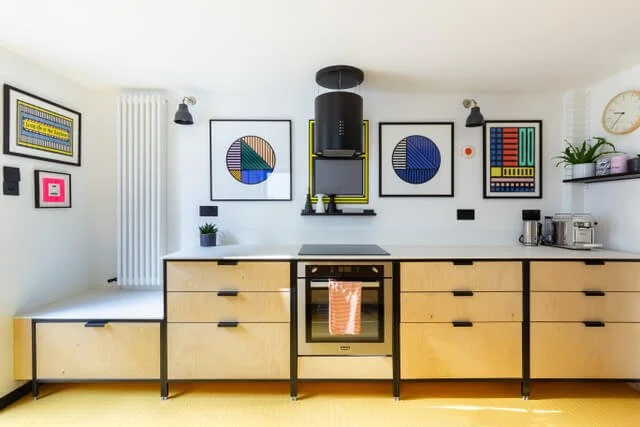 We took a turn to Memphis in this stunning custom built kitchenjetsam made kitchen with sleek lines, industrial leanings and gallery level walls for this punchy north london kitchen.